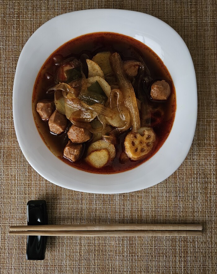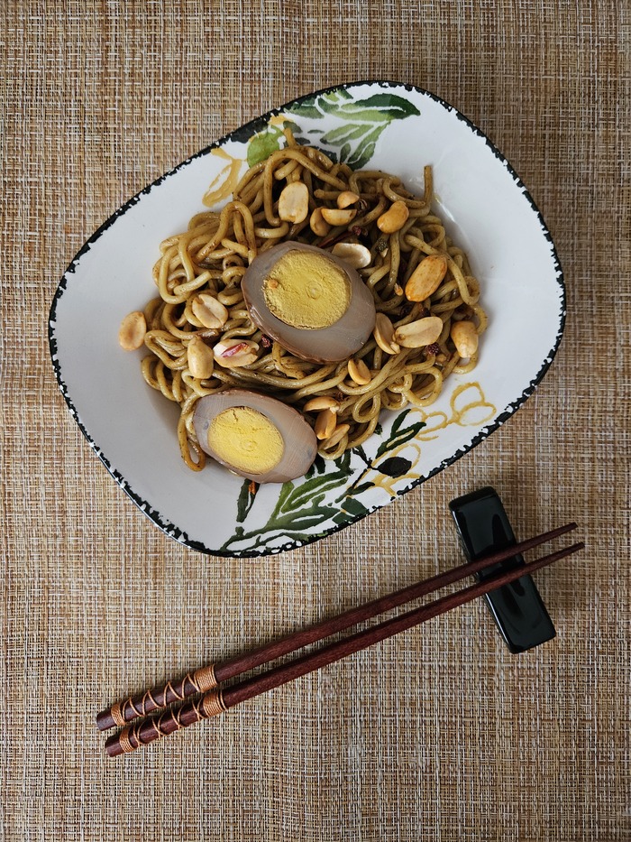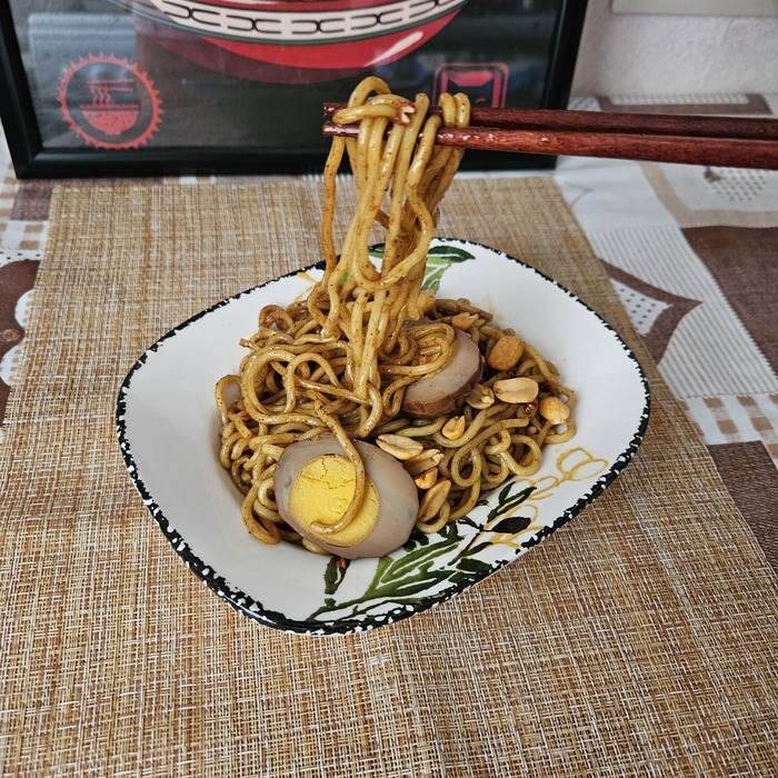 Как по мне, так вышло весьма красиво и аппетитно. Запах стоит замечательный. Пробуем, что же там на вкус. Как видим соуса немного, но тем не менее он покрыл всю лапшу. Во вкусе нас встречает кислота, которая затем переходит в лёгкую пряность. Сладость соевого соуса где-то потерялась. Остроты, в привычном нам понимании, нет, но сычуаньский перец даёт лёгкое онемение губ и языка. В целом вкус очень приятный, пикантный, без экстрима. Лапша чуть суховата, но очень вкусна. Как я уже писал выше, напоминает спагетти, но большей толщины. Маринованное яйцо плотное, на голову вкуснее тех, которые встречались мне раньше. Ну а арахис, он и есть арахис. Просто вкусный.