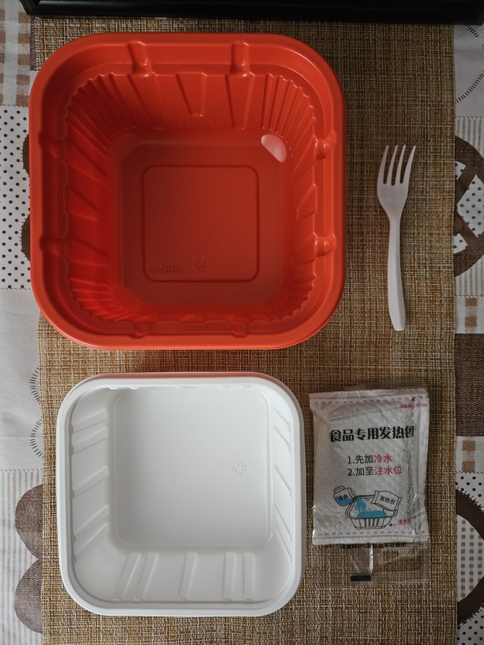 Приступаем к вскрытию. Сначала рассматриваем несъедобную часть комплекта. Она типична и представлена двумя чашами, нагревательным элементом и вилкой.