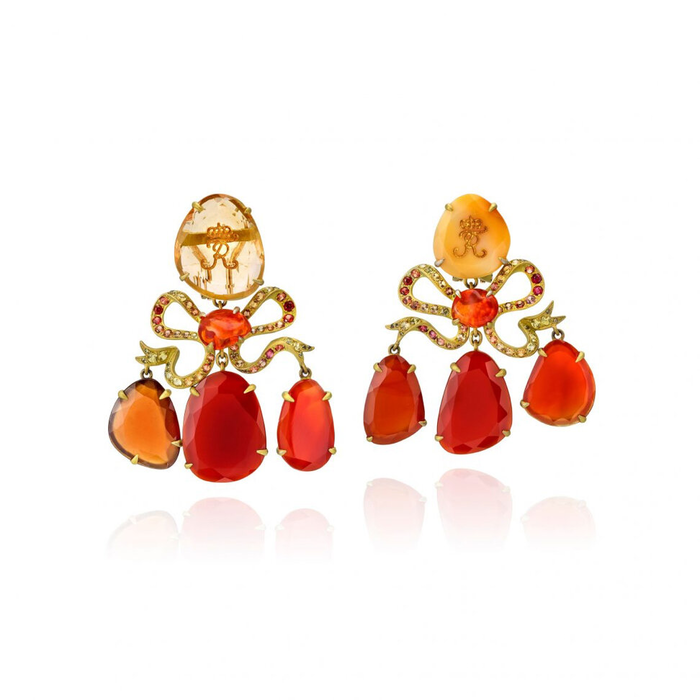 Бант из двух лент украшают бриллианты в форме огранки кушон и круглой огранки, изготовленными во второй половине 18 века. Грушевидный бриллиант желтого оттенка - съемный кулон, вероятно, добавленный в начале 19 века.
