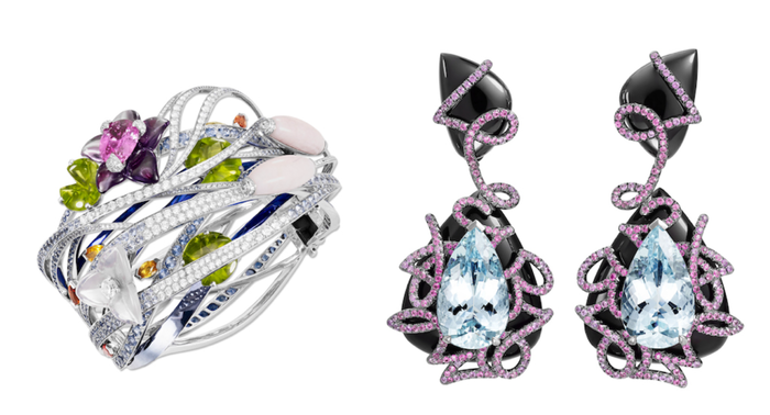 Овальные и каплевидные резные изумруды в форме кабошона, рубины огранки «калибр», бриллианты, кабошон из оникса, платина и белое золото 750 пробы.