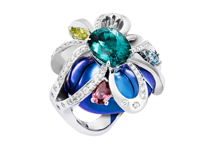 Темно-синяя, лавандовая и розовая эмаль, сапфиры в огранки кабошон и пирамидальной формы, бриллианты старинной огранки, золото 750 пробы.