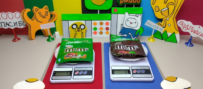 Теперь пришло время визуально оценить различие в нашем драже ,ставим на весы и видим , что обе пачки весят ОДИНАКОВО ! ПО 152 грамма .