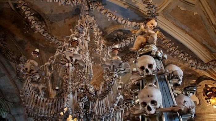 Чехия Это странный готический костел в городе Седлеце в Чехии оформленный черепами и костями примерно 40 тыс. человек. Кладбище рядом с костелом было популярным местом захоронения, потому что еще в XIII веке по нему рассыпали несколько горстей земли, привезенной с Голгофы. Но кладбище было маленькое, а желающих похоронить здесь своих родственников было много. Что бы решить задачу со свободным местом время от времени старые захоронения срывали, а скелеты складировали в специально построенном здании. В 1870 году владельцы земель, на которых стоит костел, наняли резчика по дереву, чтобы он привел в порядок залежи скелетов. И он оформил ими сам костел.