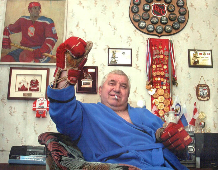 - Я продирался по бортику, а он со всей силы ударил меня клюшкой в бок. Я тут же сбросил перчатки и пошел на него. Канадец вызов не принял и стал загораживаться клюшкой. Тут подскочил еще один канадец, Бергман, лысый такой, схватил меня за шею. Потом кто-то подставил мне подножку, и я стал падать, успев схватить Жильбера за волосы. Так мы вместе и упали. Подраться нам не дали. Со скамейки запасных ему на подмогу прилетели еще несколько канадцев. Образовалась куча-мала из восьми человек, семеро из которых были канадцами. А что же наши? Они все это время стояли в сторонке и смотрели, как я в одиночку бьюсь в толпе канадцев. Когда нас с Жильбером удалили, я со скамейки штрафников показывал ему жестами – сейчас отсидим, а потом давай схлестнемся один на один. Он опять отказался, - Евгений Мишаков.