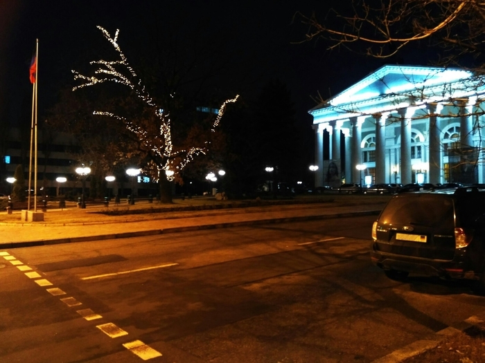 А это немного в отдалении. Главную ёлку города уже поставили и собирались украшать. Обещали открыть к 24 декабря. Если приглядеться, то можно заметить постамент дедушки Ленина, собственно в его честь и названа главная площадь города (пл.им. Ленина).