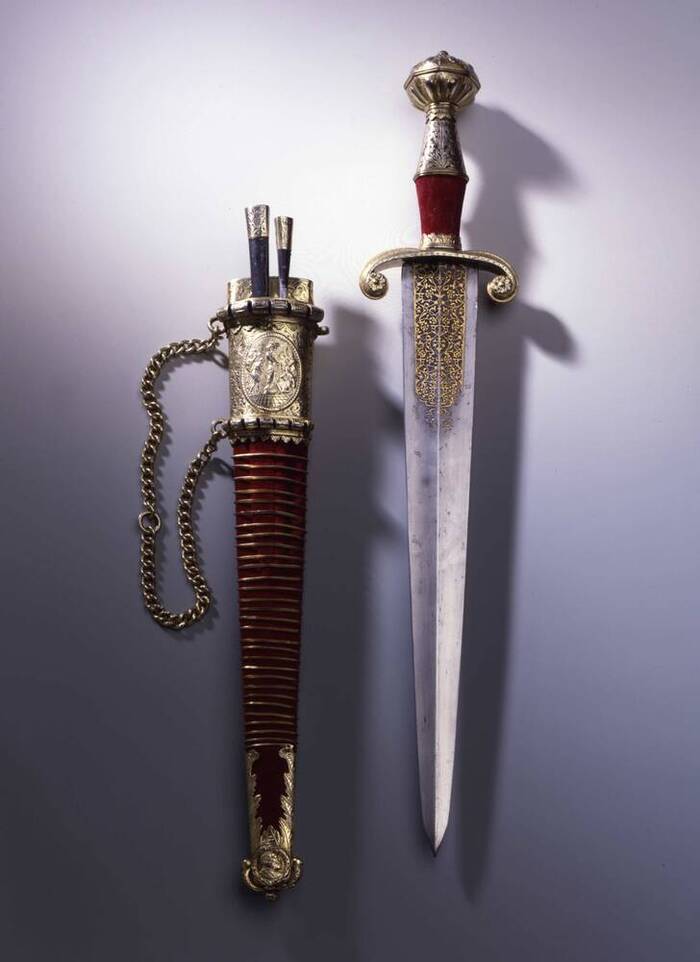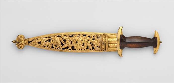 Швейцарский кинжал с ножнами, около 1570 года. Материал: сталь, золото, бронза, дерево, текстиль. Размеры: длина кинжала с ножнами (44,8 см); длина без ножен (40 см); Вес кинжала (496,1 г); Вес ножен (377 г).