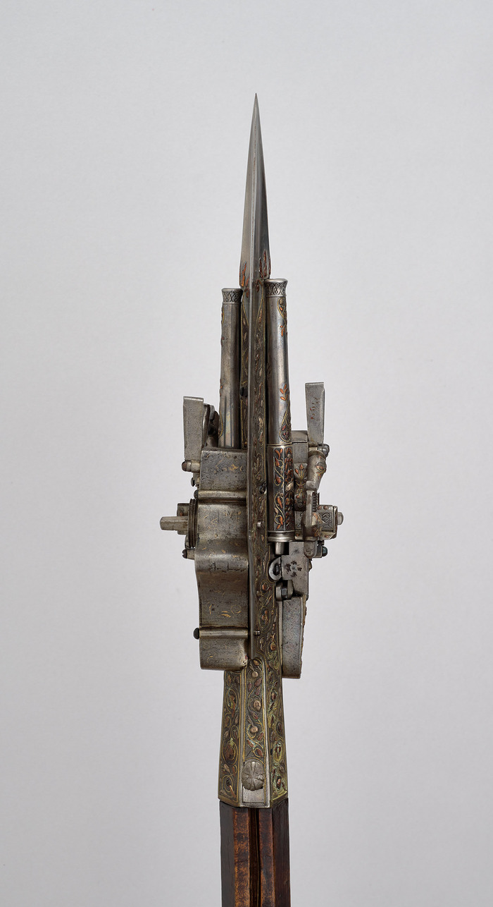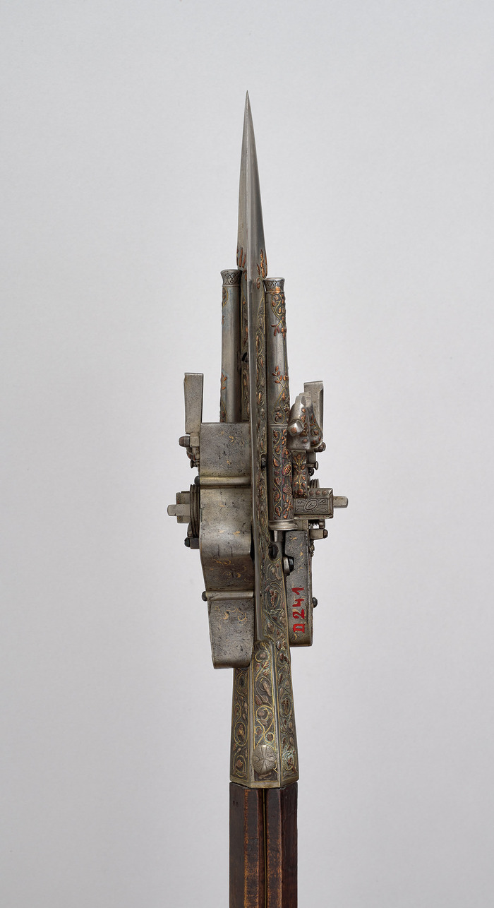 Копье, украшенное медью, серебром и золотом, оснащенное двумя миниатюрными пистолетами, Франция, примерно 1600 год. Музей истории искусств, Вена
