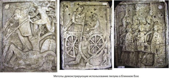 На метопах II в. н.э. (каменных плитах) Адамклиси в Румынии также встречаются сцены, в которых легионеры поражают врагов пилумами в ближнем бою.