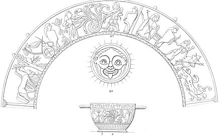 Здесь изображён обнаженный Геракл с колчаном за спиной и луком в правой руке, шагающий влево в сопровождении Гермеса. Геракл угрожает Аиду камнем, который убегает налево, в то время как богиня, возможно, Персефона или, возможно, Афина, стоящая перед троном Аида, предотвращает нападение. Цербер с единственной собачьей головой и змеями, поднимающимися из головы и тела, бежит вправо. Крайняя справа колонна указывает на вход во дворец Аида. Многие элементы этой сцены — Гермес, Афина, Аид, Персефона и колонна или портик — часто встречаются в более поздних работах. Считается, что на другом раннем изображении, фрагменте рельефного пифоса с Крита (ок. 590–570 до н.э.), изображен Цербер с головой льва и змеей (с открытым ртом) за спиной, которую ведут вправо.