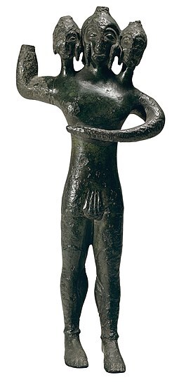 Но отнюдь не всегда Цербер имел именно три головы! Так, Гесиод описывал Цербера псом аж с 50-ю головами, а лирик Пиндар наделил его 100 головами, подобно Гидре и Тифону. Со временем количество голов Цербера заметно сократилось. В искусстве Цербер, подобно своему брату Орфу/Ортросу, чаще всего изображается с двумя собачьими головами (видимыми), никогда не более трех, но иногда и только с одной (пример - утерянная коринфская чаша Аргоса, самое раннее изображение Цербера в 6 веке до нашей эры):