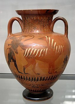 Лаконская чаша середины шестого века до н.э. работы неизвестного художника -охотника добавляет к сцене несколько новых черт, которые также стали обычными в более поздних работах: три головы, змеиный хвост, цепь Цербера и дубина Геракла. Здесь Цербер имеет три собачьи головы, покрыт мохнатой змеиной шерстью и имеет хвост, оканчивающийся змеиной головой. Его держит на цепном поводке Геракл, который держит свою дубину над головой.