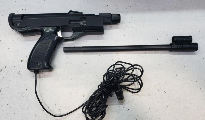 Я полез разбираться - и вот что выяснилось. Подобные световые пистолеты пошли родом из Америки 80-х годов. Они использовались как аксессуары к игровой приставке "Vtg Unisonic Tournament 2000 Action TV Video Game System Console". Вот такой...