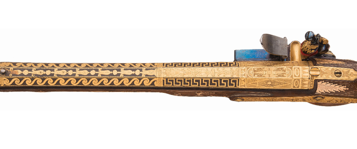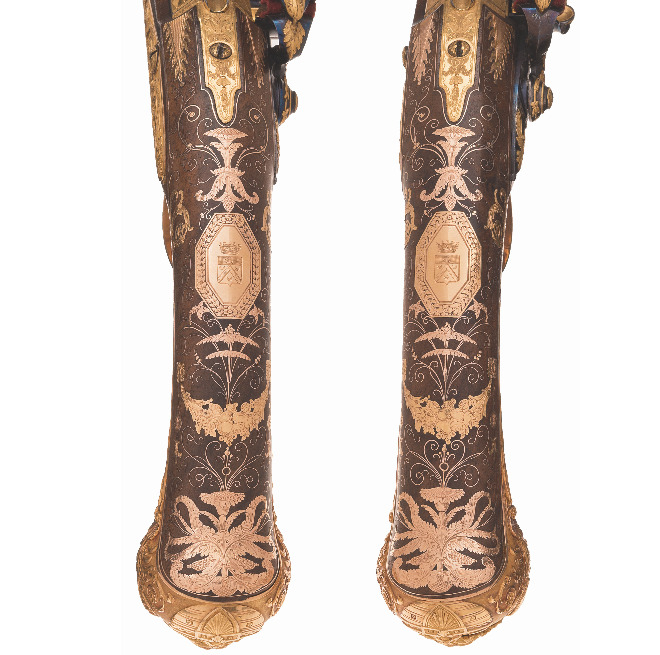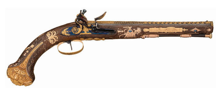 Изготовлены Николя Ноэлем Буте, мастером-оружейником и директором Версальской оружейной палаты. Пара офицерских кремневых пистолетов Французской империи в золотой оправе, подаренных контр-адмиралу Сезару-Жозефу де Бурейну, барону де л'Эмпайр. Они были подарены ему купцами Иль-де-Франс в честь его успеха в разгроме британского корабля «Лорел», блокировавшего остров.