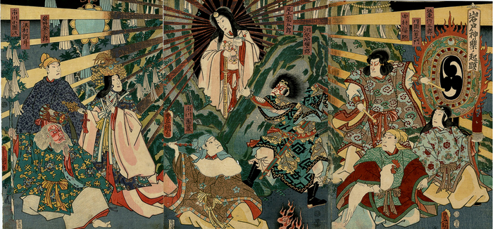 (Для тех, кто досюда долистал, интересный спойлер: в центре танцует Амэ-но удзумэ, но она там не просто танцевала, а устроила тру-стриптиз))