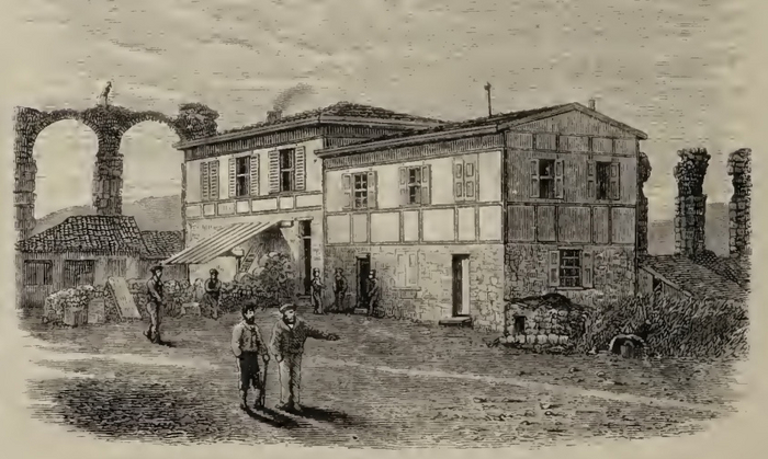 Дом в Аясалуке (деревня на месте древнего Эфеса), где жили рабочие (Литография М. и Н. Ханхарт, Лондон. Из книги «Открытия в Эфесе», 1877 г.)