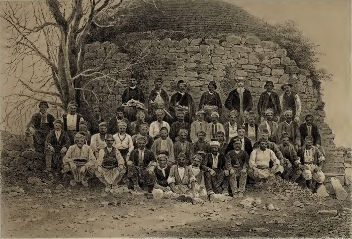 Джон Вуд и турецкие рабочие, участвовавшие в раскопках храма Артемиды (Литография М. и Н. Ханхарт, Лондон. Из книги «Открытия в Эфесе», 1877 г