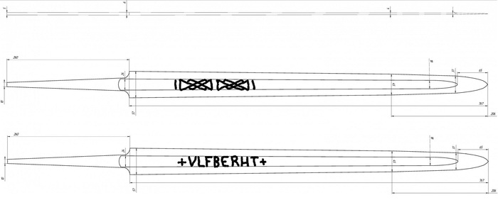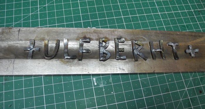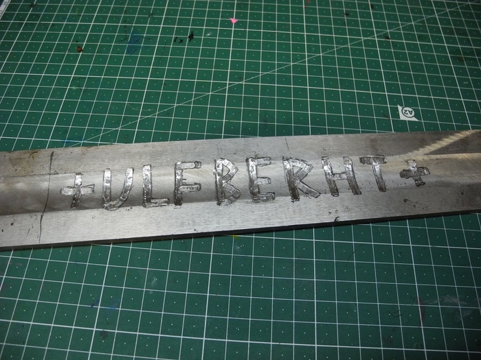 Клинок я изначально хотел с двусторонним клеймом. На одной стороне +ULFBREHT+, на другой плетенку, а поскольку каталогов археологических находок с точными размерами и прорисовкой клейма очень мало, воспользовался докторской диссертацией Мико Молайнена: «Marks of Fire, Value and Faith Swords with Ferrous Inlays in Finland during the Late Iron Age» (ca. 700–1200 AD) кому интересно ссылка https://www.utupub.fi/bitstream/handle/10024/119919/diss2016...
