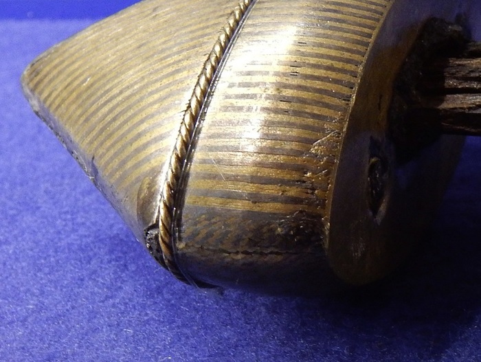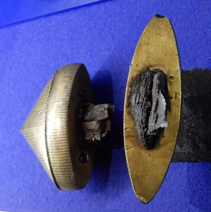 С торцов перекрестия и основание навершия закрыты латунными пластинами которые припаяны к металлическому основанию. Перекрестие мечей типа Н, да и практически всех мечей, за исключением типа D, L, сплошное.