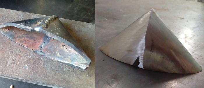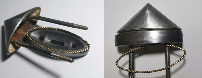 Как первой, так и второе навершие я честно сварил полуавтоматом из двух половин которые вколотил из листа шестерки. За то вполне аутентично припаял латунью штифты которыми навершие крепиться к основанию. И получилась вот такая штука, осталось украсить и насадить.