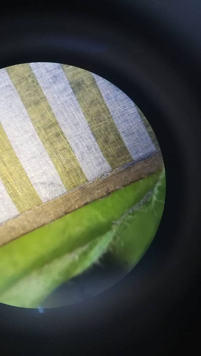 Я тогда чуть не запил честно говоря. Но сдержался и маленько поэксперементировав, понял что нужно делать. Во-первых резать следующую канавку нужно когда в предыдущую уже забита проволока, и резать надо по ее краю. Во-вторых ( тут я не сам допер, а пропизделся один из мастеров топ уровня) нужно не шлифовать забитую проволоку, а сначала загладить ее, твердой и гладкой металлической пластиной, в моем случае это был отшлифованный и отполированный напильник. Вообщем я все переделал, и не один раз кстати. Но в конце концов получилось не хуже чем у мастеров. Проволока серебро + латунь, (две проволоки серебра через две проволоки латуни как у оригинала) Плотность 18 проволок на сантиметр. Всечка под микроскопом.Каждая полоса желтая или белая, 1 миллиметр, и состоит из двух проволок.