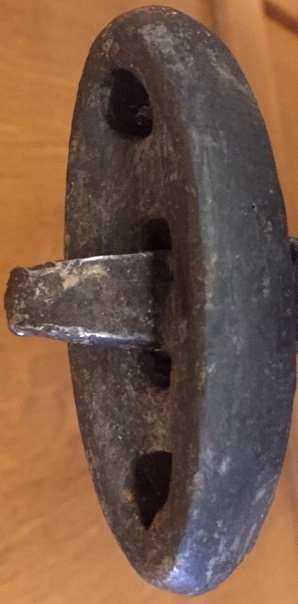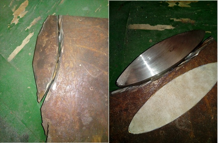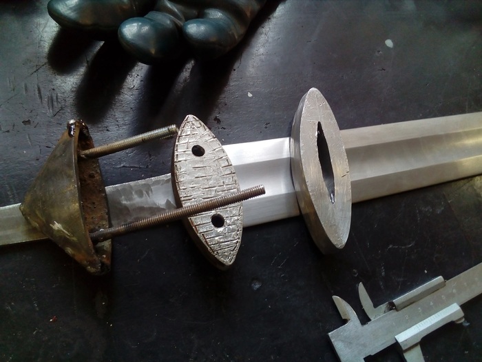Все элементы рукояти были вырезаны мной из железного листа толщиной 20 мм, так как абонемент в кузницу закончился на клинке, и пришлось довольствоваться тем инструментом, что есть у меня, смотреть там особо не на что две фотографии было, стало. И готовый результат, основание наврешия и перекрестие с уже прошитым отверстием под клинок и облуженные с торцов. Навершие пока не получилось, на него не смотреть.
