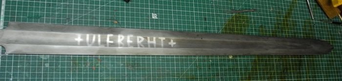 Но не суть. Происходит это меч из погребения или вотивного дара, поскольку ритуально сломан. Клинок сохранился отвратительно но клеймо Ульфберт читается уверенно, поэтому никаких моральных препонов использовать клинок с однотипного меча изготовленного по размерам приведенных в дисере Мико Молайнена я не увидел.