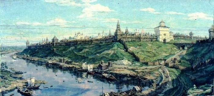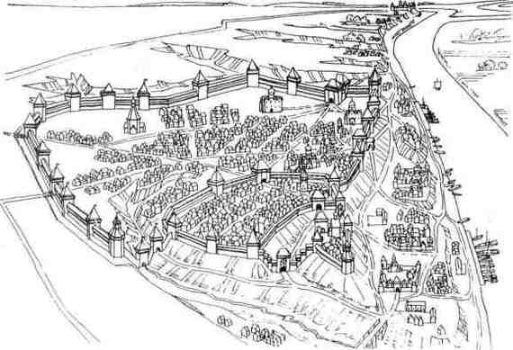 Реконструкция Рязани В. П. Даркевичем. Источник: «Путешествие в древнюю Рязань: Записки археолога».