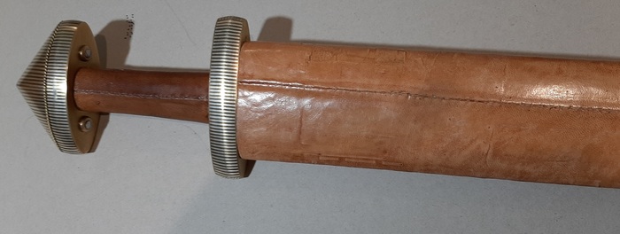 Форма рукояти меча я подсмотрел на мечах типа D, они собственно на большинстве мече с сохранившимися деревянными деталями такие. Сделал ее из двух половинок, склеил и обтянул кожей. Кожу взял тонкую, ягнячью, вырезал в размер, и сшил обметочным швом в трубку, лицевой стороной внутрь. Намочил, вывернул и натянул на деревянную рукоять.