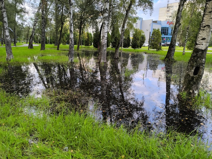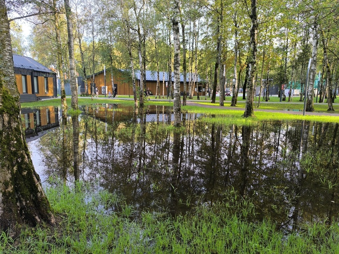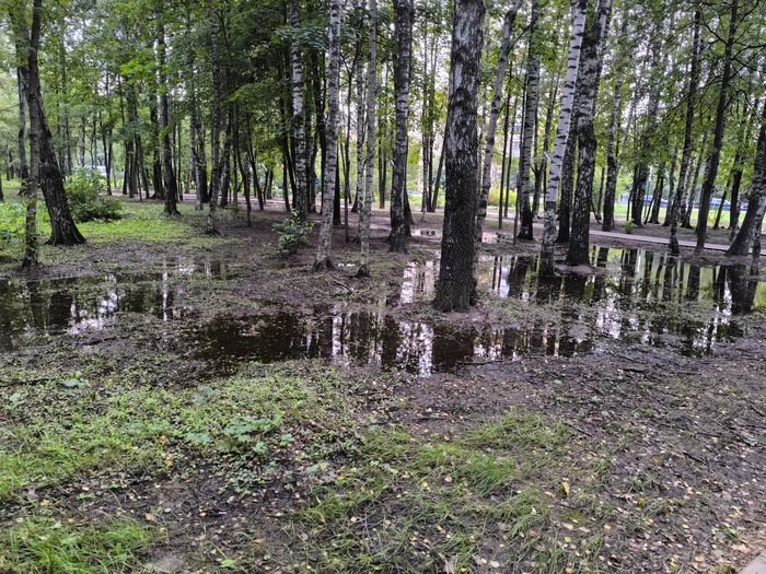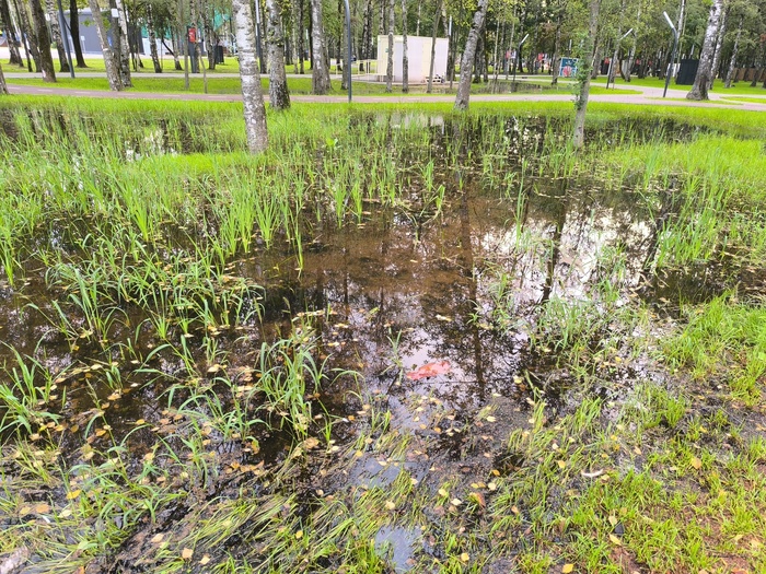 Раньше вода уходила естественным образом, и по трубам проложенным под дорожками. В новом проекте про это забыли... Или забили.... В результате после таяния снега, а я напомню, что зима была малоснежная и снега то было всего ничего, парк превратился в болото. Красивые дорожки затоплены, деревья стоят в воде, корни соответственно гниют.