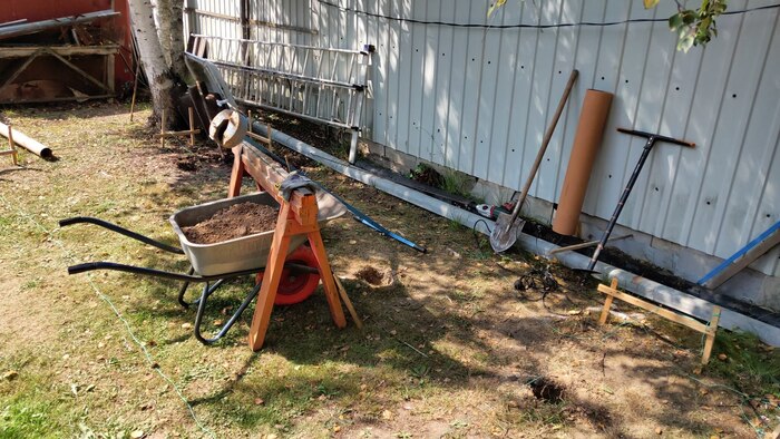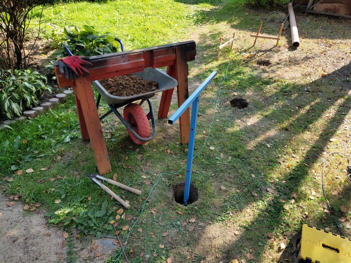 Уже после завершения дровника, осенью этого года я таки сподобился сделать удлинитель к фискарсу, теперь он бурит на глубину до двух метров. Но на тот момент удлинителя не было и заниматься им было некогда. Поэтому достаем из арсеналов бур Тисэ.