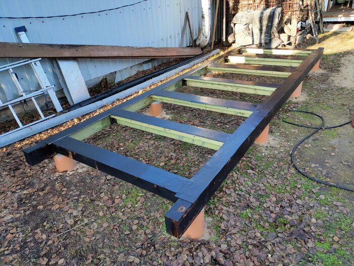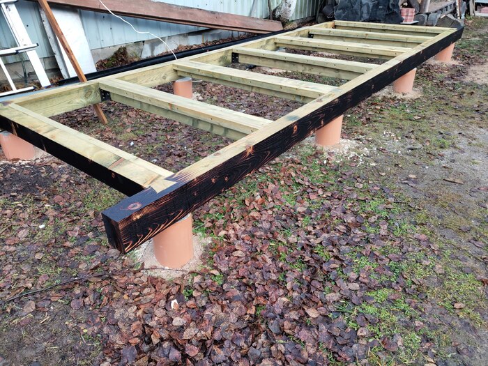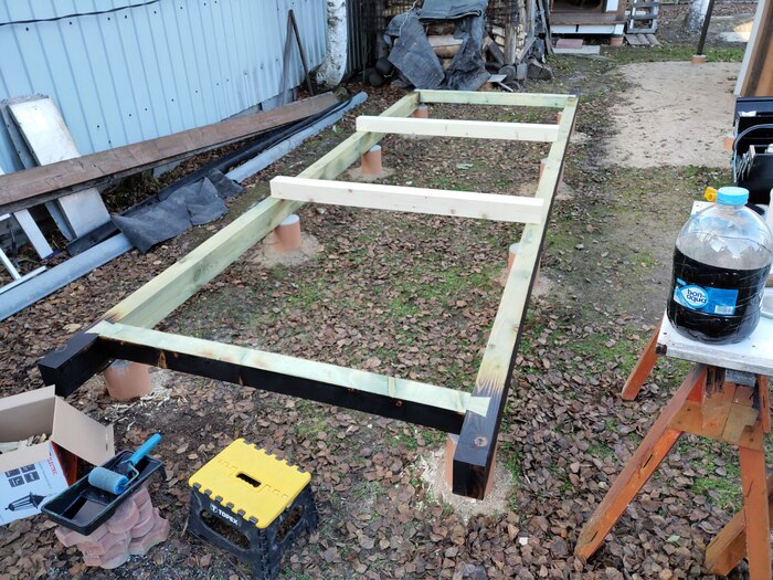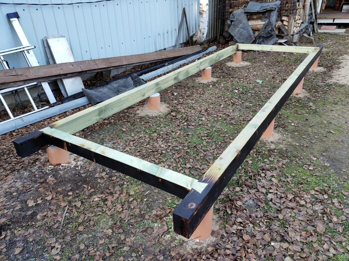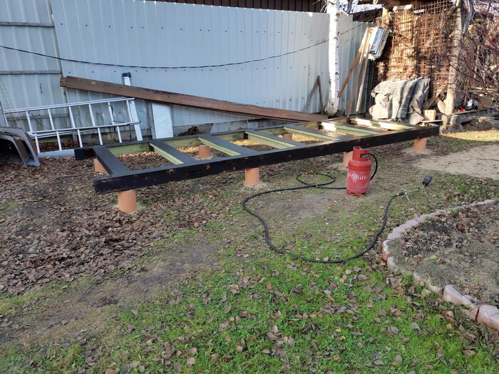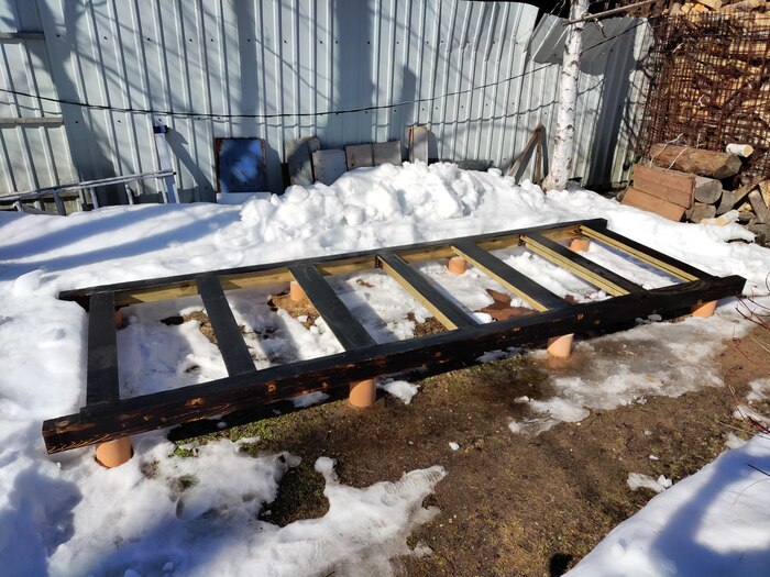 Ну и в таком виде, основание ушло в зиму. Напоследок наплавил стеклоизол, он в любом случае нужен под полы, потому что между досками пола будет зазор. Если поверхность древесины не защитить, то она начнёт довольно быстро гнить. Ну и заодно так это всё будет меньше мокнуть в ожидании крыши.