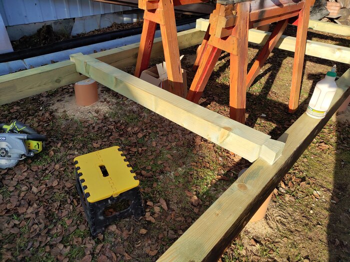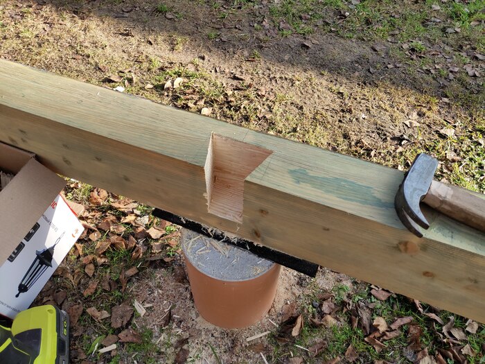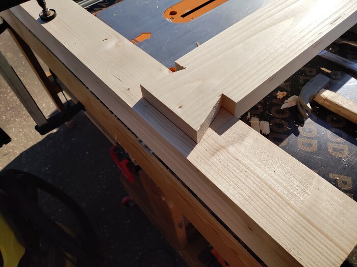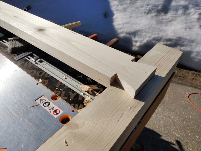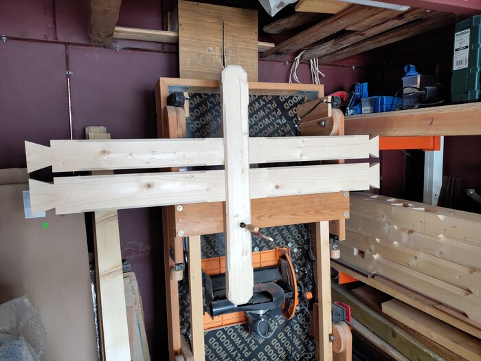 Ну и вот то, на что я намекал в прошлом посте: поперечины решил сажать на ласточкин хвост. Понятно, что особой необходимости в этом нет, такое соединение в данном случае делается скорее "для форсу бандитского", потому что оно даже видно в итоге не будет.  Но в целом оно намного прочнее и надежнее чем стандартное "в пол дерева". Не говоря уже о каких-нибудь уголках или перфорированных креплениях бруса. К тому же я еще Тайтбондом промазывал. Надеюсь разбирать мне этот дровник не придётся)
