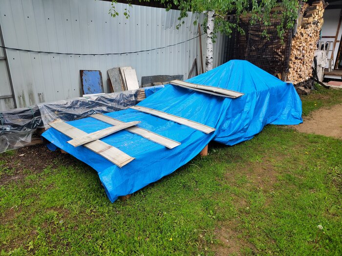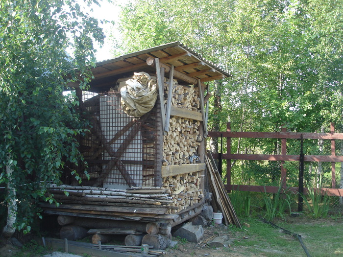 8 кубов березовых полешек. Впритык, но влезло. На боках теперь сварная сетка - остатки от заливки бетонной отмостки дома. Старая дверь, берёзовые жердины. Гулаг-стайл конечно, но тогда это казалось несущественным на фоне радости от лицезрения запасов).