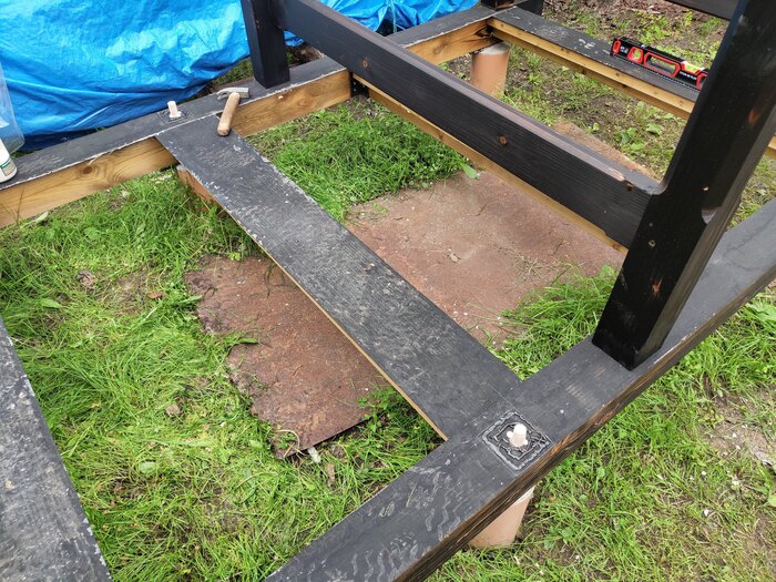 Также добавил три промежуточные лаги из доски 50х150. Прикручены короткими глухарями на самодельные уголки. Напилил их из старого металлического профиля 50х50 и насверлил отверстий. Да, кто-то скажет, что это нерационально, но по времени - то же самое, что съездить за уголками в магазин. Плюс не нужно ломать голову куда пристроить кусок старого уголка из кучи лома. Нарезать болгаркой не сложно, для отверстий есть сверлильный станок, т.е. тоже не утомительно.