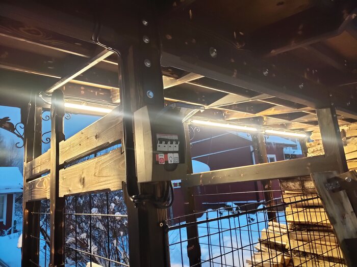 Освещение - три линейных светильника внутри для подсветки дров и два подвесных - для антуражу и визуального удовольствия. На крайних передних столбах с нижней стороны приделал две розетки. Это никогда лишним не бывает. Сейчас, к примеру, в одну из них воткнут подогрев котохатки. Ну и раз есть электрика, то нужен и щит - двухполюсный ввод, розетки, свет. Провод без гофры, считаю что это лишнее, это же дровник, чему там гореть)