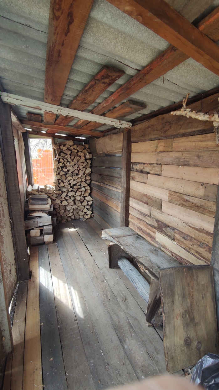 Постепенно вывезли практически весь неликвидный хлам, навели порядок. Напротив дома стоит дровник. Небольшой сарай. Он был полностью завален досками и хламом. Часть досок была отправлена на дрова, освободил место для дров немного и до наступления тепла туда особо не заглядывал. А как стало потеплее, решил, нет РЕШИЛ навести там немножко порядка. Фотографии с самого начала процесса что-то поленился делать.