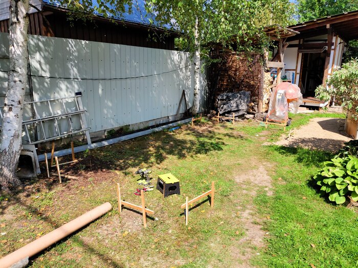 Стояло оно так потому, что нужно было подготовить сетки для ограждения. Использовал остатки сварочной сетки для отмостки вокруг дома. Было два вида, покрупнее - пустил на боковые стенки, помельче на задние. К концам проволоки приварены шайбы, в них вкручиваются саморезы. Шайб сотни полторы. Но я справился с приваркой за пару дней не особо напрягаясь. А вот с чем я не справился даже напрягаясь, так это с покраской. После того, как осилил половину одной сетки, понял, что это неподъёмная для меня задача. Выручила жена - пол дня и всё готово :)