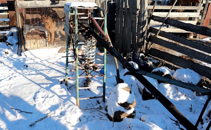 Уникальное инженерное сооружение. Некоторые посмеются и скажут, мол,сделал из говна и палок. Не совсем. Для построения аппарата Олег использовал: трубы, уголки, 32-х килограммовую гирю, пружины – одна от вазовской «шестерки», другая от «девятки», каркас от старой советской качели, детали топора.