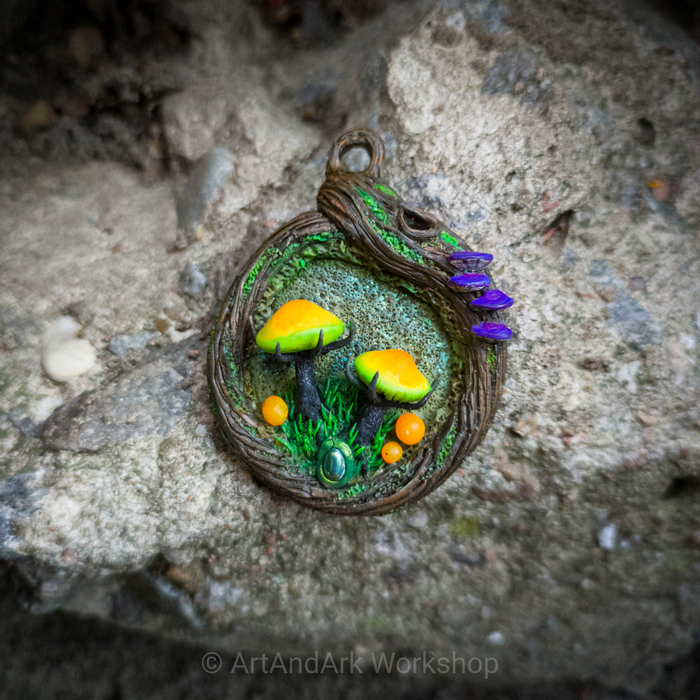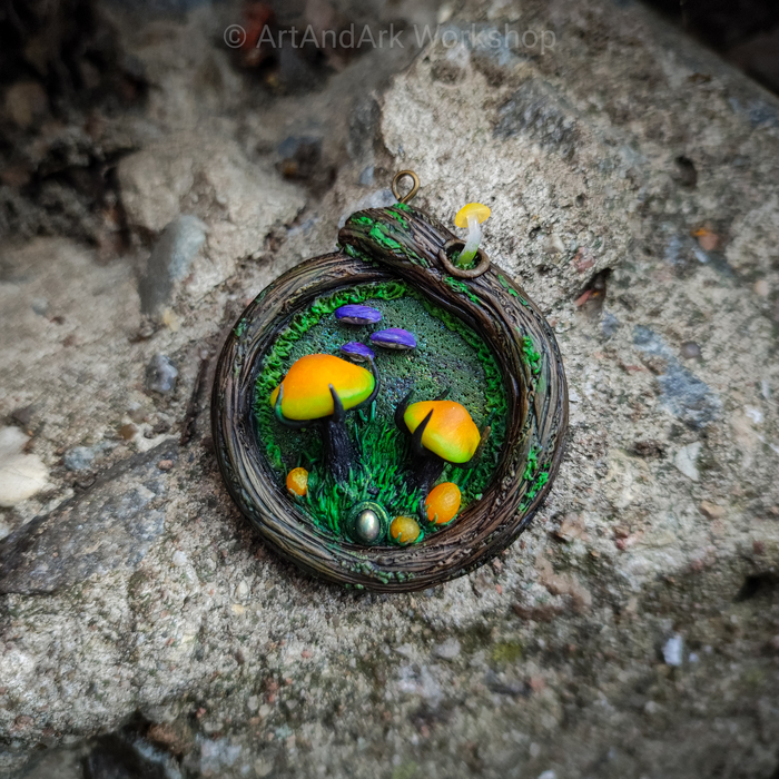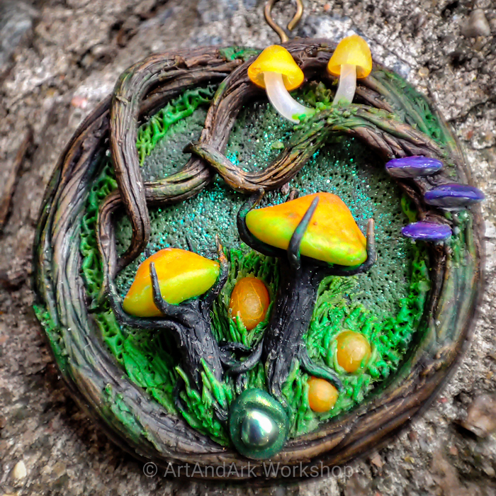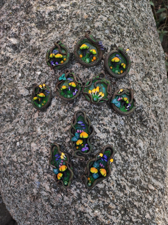 На кулонах можно рассмотреть молодые грибные деревья (грибочки), ежовик лазурный, алоказию, огненный гриб, головы червя ...