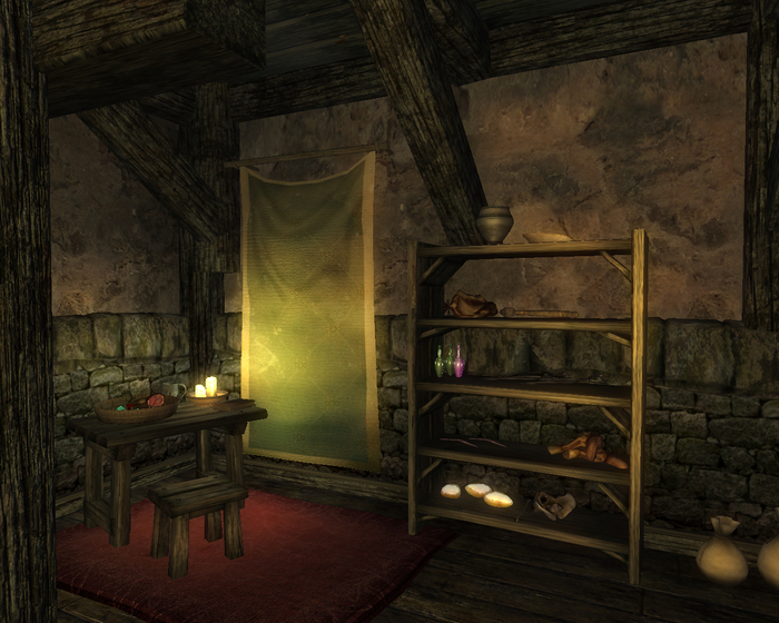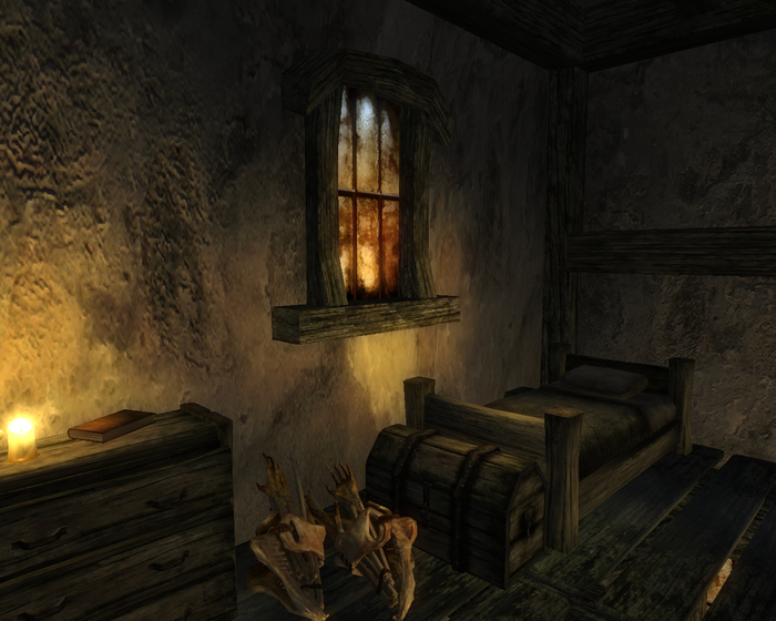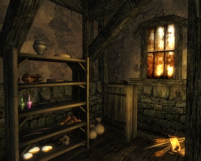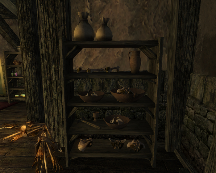 Расположен на окраине Пасваля рядом с гигантским грибным деревом. Принадлежит норду Джейриду Ледяные-Нервы. Хозяин не запирает дверь даже в свое отсутствие, так что осмотреть его можно в любое время. Внутри чисто, кое-где наличествуют коврики и гобелены, в одном месте на стене висит мишень. Прямо напротив входа сложен камин, труба которого поднимается посреди помещения под крышу. На второй этаж ведет деревянная лестница, но там скорее не этаж, а антресоль с кроватью и комодом. По результатам осмотра можно сделать следующие выводы. Первое, у хозяина какой-то бзик, связанный с костями – они в доме повсюду: на столах, на полках, на полу. Второе, в столкновениях хозяин привык полагаться на лук. Третье, хозяин достаточно образован, по крайне мере обучен грамоте, о чем свидетельствуют имеющиеся в доме три книги: «Кора и живица», «Предшественники» и «16 аккордов безумия, т. IX».