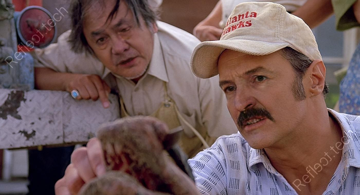 "Ударов о землю презервативы не выдерживали и лопались. Поэтому после каждого дубля манекен вскрывали, мыли, заполняли новой партией "кишок" и склеивали,- вспоминает Вудрафф.- Мы рассчитывали на то, что эпизод удастся снять с трёх дублей. А их понадобилось девять, так что презервативов не хватило. Мы отправили Митча Кофлина — самого молодого парня в команде — в местную аптеку. Трижды за день Митч бегал туда пополнять запасы, его прямо зауважали там".