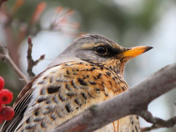 Птенец-слёток дрозда-рябинника. Он хорошо прыгает по парку, но у него еще не вырос хвост.