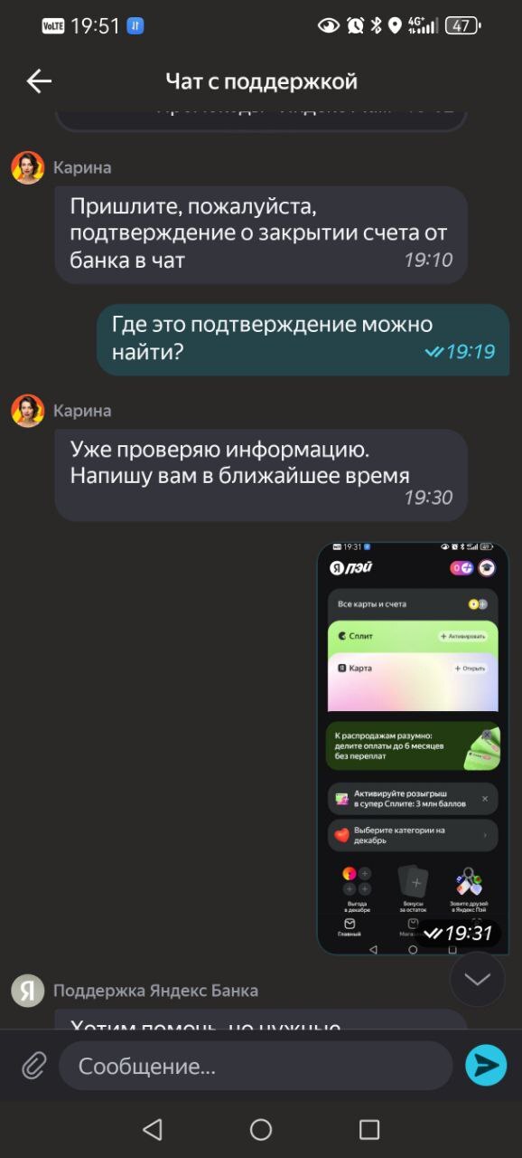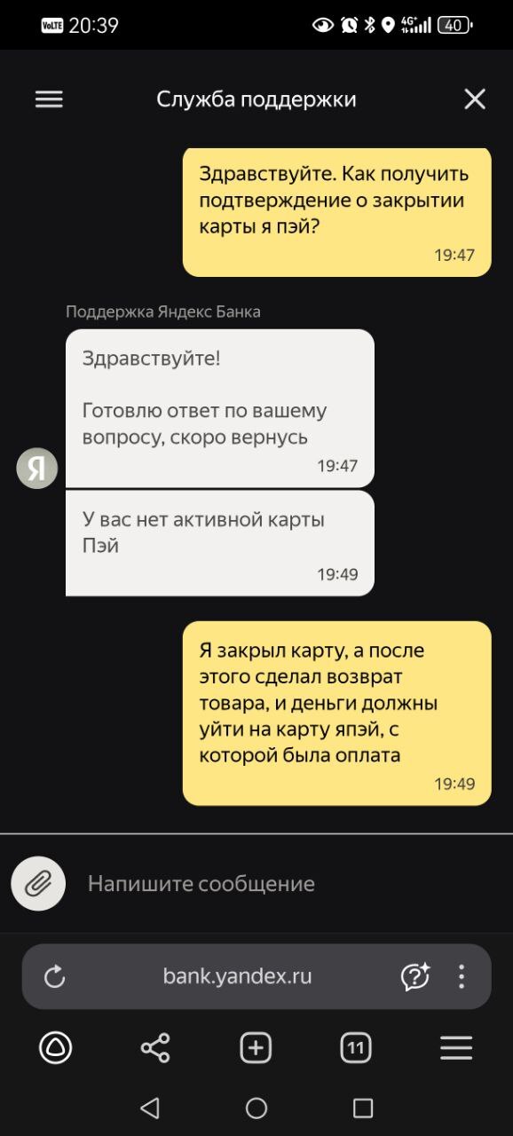 Привет Пикабу! Ситуация такая, увидел вкусные цены на ямаркет по япэй. Оформил япэй за минуту, сделал заказ, он разбился на 4. Ну ок! На следующий день цены на то,что я купил выросли почти в 2 раза, ну ок, это ожидаемо, яндекс так и делает, если есть япэй, плавали, знаем. Потом я закрыл япэй и яплюс, чтобы не забыть и чтобы по тихому не списали оплату за последующий месяц . Забрал 3 из 4х заказов, всё ок. А вот 4й заказ, детская каша, приехала порванная, сделал возврат. Дома понял, что деньги за возврат ушли на закрытую карту япэй... Далее состоялся диалог с техподдержкой япэй, ямаркет и горячей линией. Техподдержка ямаркет сказала, что нужно подтверждение, документ, о том, что счет закрыт. Далее состоялся диалог с техподдержкой япэй, те просили фото с Паспортом!, зачем то, в итоге нужно лишь было попасть на грамотного оператора в ямаркет, которому нужно было сказать, что просите его по причине отсутствия карты япэй, вернуть на личную карту...Нужно сбросить ФИО, БИК и номер счета личной карты.