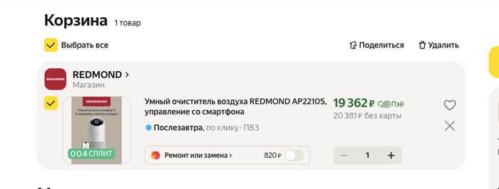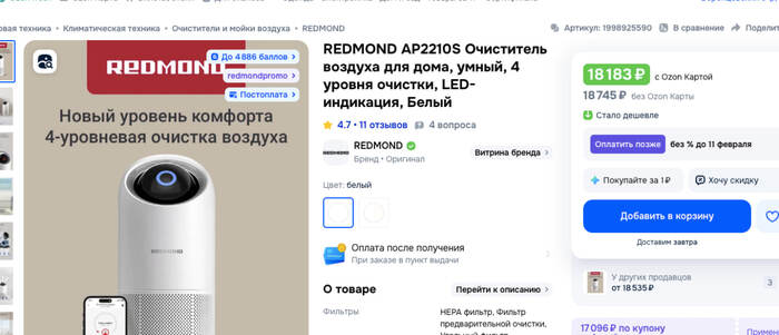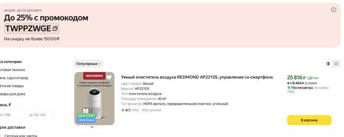 Балуюсь я значит как и все колесом призов, как и все ничего толкового не выигрываю, прилетает мне приз промокод-скидка на 25% на технику Redmond, а я как раз приглядываю себе очиститель воздуха. Как видно на скриншотах цена до применения промокода 25816 рублей.