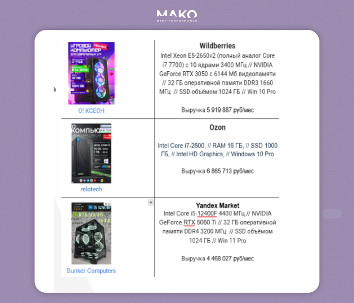На основе анализа сформировали и начали продвигать 4 новых сборки в различных вариантах комплектующих. Они стали хорошо продаваться.