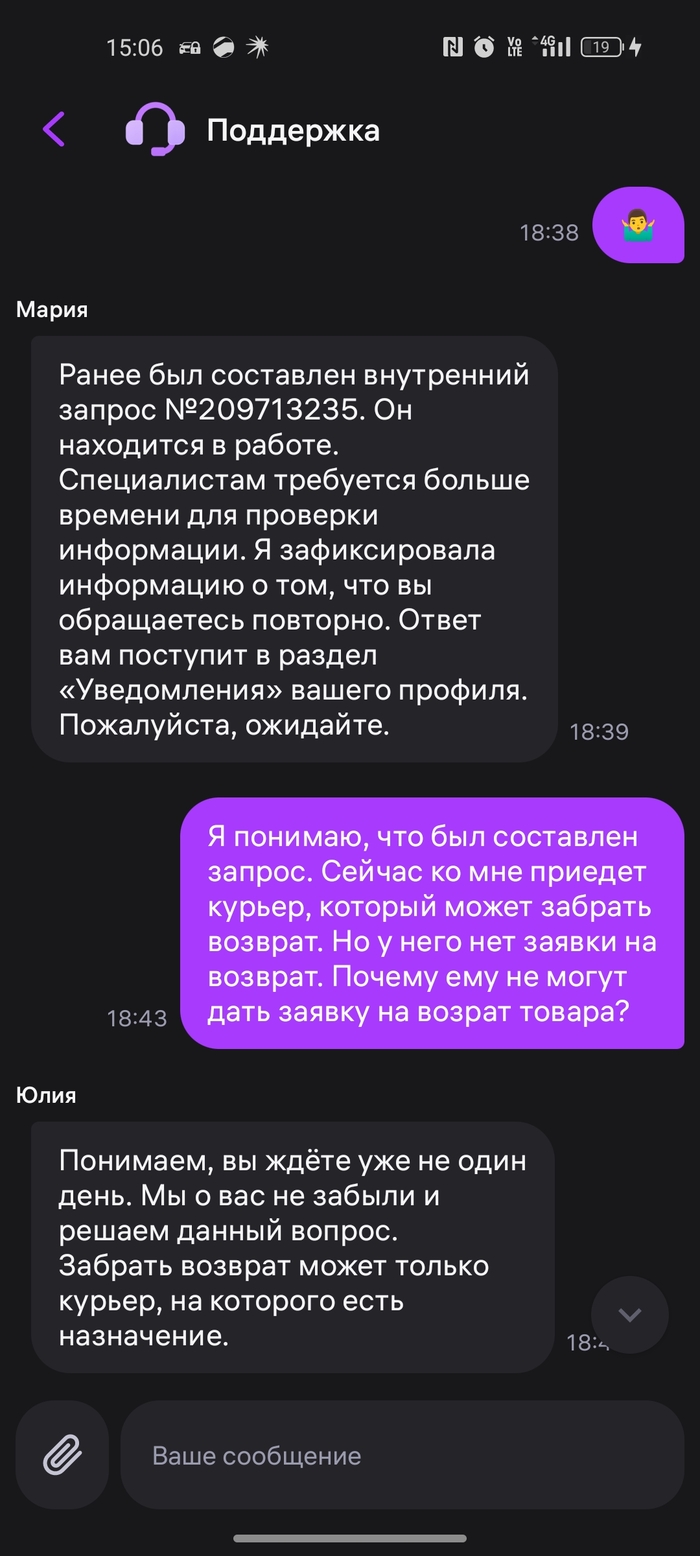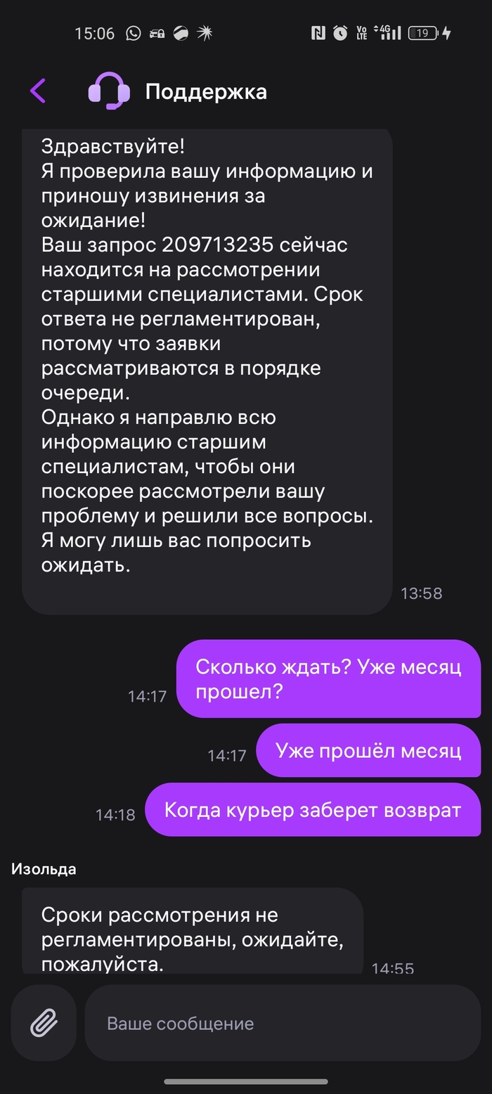 Вот такой текст я получаю на свои запросы. Ничего не происходит. Стоимость товара более 20000 рублей. Их мне тоже никто не возвращает. Получается что товар хранится у меня дома бесплатно. И деньги мне никто не возвращает. Сплошная прибыль интернет магазина. Когда уже этот беспредел закончится.