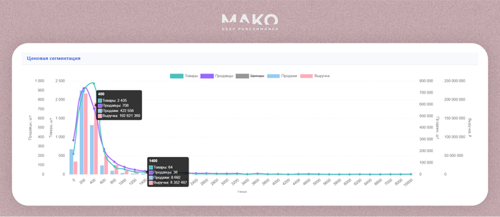 Причем максимально востребован ценовой сегмент 400-600 р. А тот, в котором работал производитель спортивной бытовой химии (1200-1400) имел узкий спрос. Объем продаж в масс-маркете был в 23 раза больше.