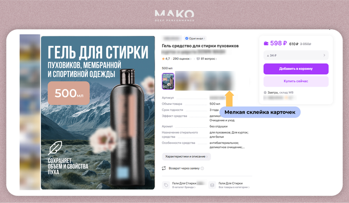 Ранее производитель бытовой химии использовал в рекламе слишком большие склейки карточек (объединения нескольких товарных позиций в одну). Этот прием используют многие селлеры, чтобы:
