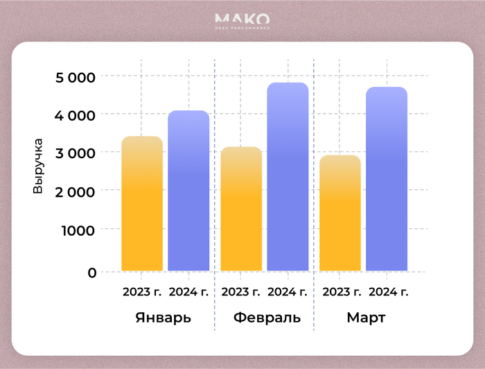 Когда производитель бытовой химии продавал только профессиональные средства и был ограничен РРЦ, участие в распродажах было ему заказано.Но после разделения линеек на b2c и b2b появилась возможность участвовать в большем количестве акций и увеличить охваты. В целом, новая стратегия принесла магазину за первые 3 месяца рост продаж на 61%. Сравните показатели за первые 3 месяца 2023 г. (до нас) и 2024 г.