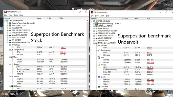Например, настроив напряжение для Nvidia GeForce RTX 3060 удается уменьшить потребление на внушительные 30 W без потерь производительности. Температура при этом опускается на семь градусов, а вентиляторы работают тише. И это не предел!